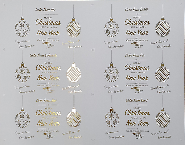 - Unterschiedliche Namen, fortlaufende Zahlen und Unterschiften im Digitaldruck mit Heissfolie veredeln