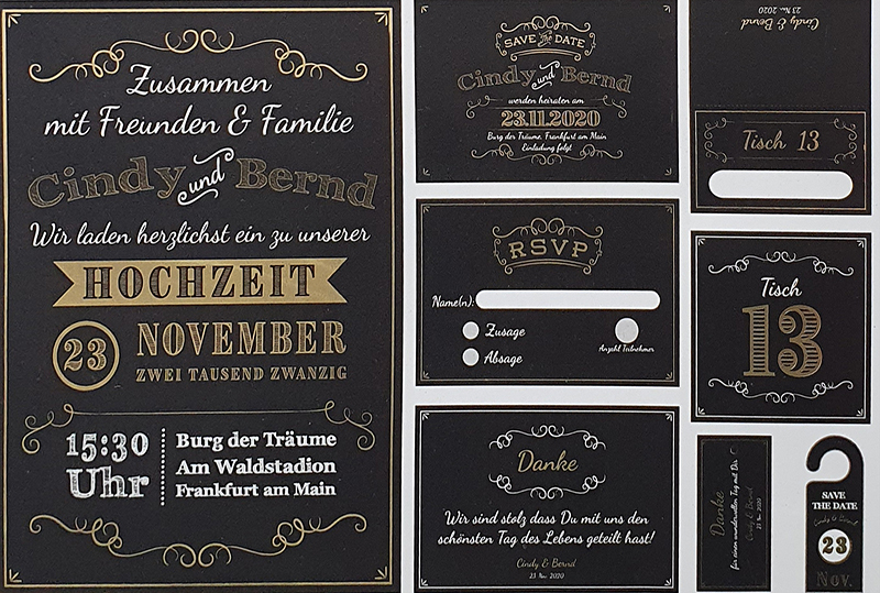 Somit lassen sich Ihre Digitaldrucke komplett individuell mit unterschiedlichen Namen, fortlaufende Zahlen, in Gold,